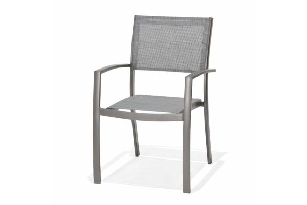 Stacking armchair made in aluminium and Weather-net®. Grey colour with sanded effect. Folding aluminium table with Duraboard® table top.